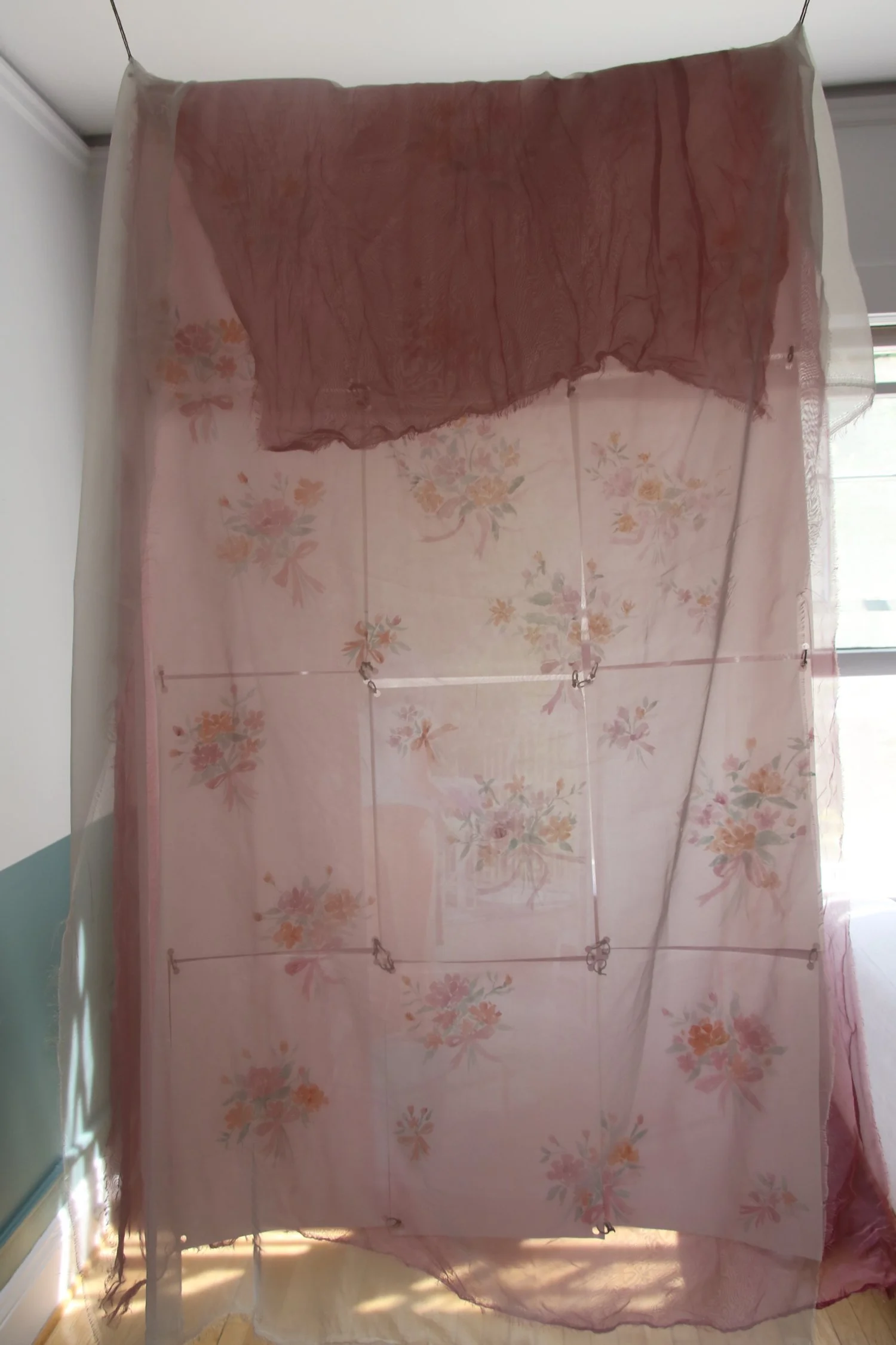 The watercolor drawings of flowers mimic the patterns on the bedsheets that were laid out for my mother and I during our visit and the twelve sections are assembled like window panes. When hung, the piece resembles a bedsheet hung to dry and moves in the breeze. However, the portal can be easily folded, transported to a new location to act as a vessel for imagination.
